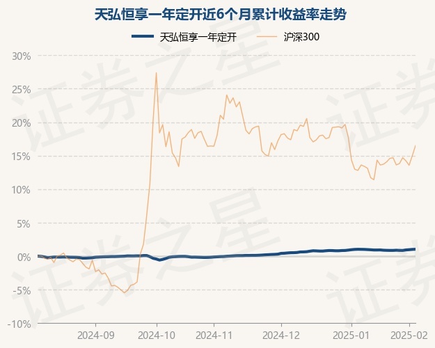 证券之星消息,2月7日,天弘恒享一年定开最新单位净值为1.1434元,累计净值为1.1434元,较前一交易日上涨0.03%。历史数据显示该基金近1个月上涨0.02%,近3个月上涨1.05%,近6个月上涨1.03%,近1年上涨3.32%。该基金近6个月的累计收益率走势如下图: