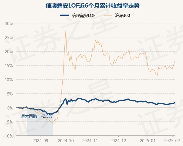 证券之星消息,2月7日,信澳鑫安LOF最新单位净值为1.005元,累计净值为1.383元,较前一交易日上涨0.3%。历史数据显示该基金近1个月上涨0.0%,近3个月下跌1.41%,近6个月上涨1.73%,近1年上涨2.62%。该基金近6个月的累计收益率走势如下图: