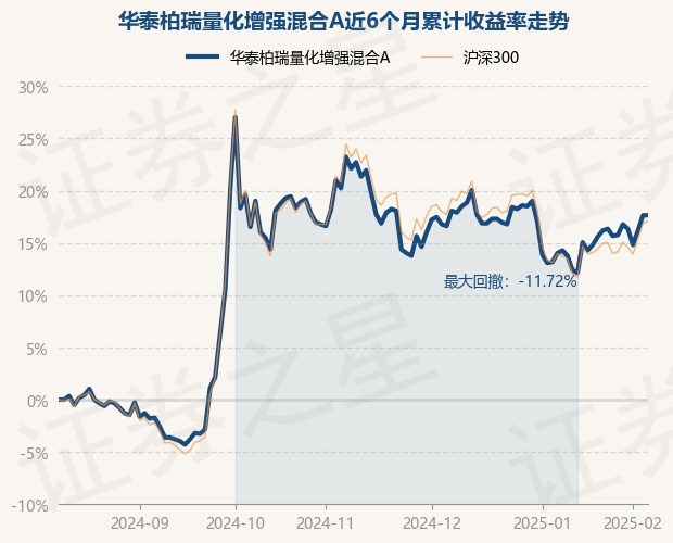 证券之星消息,2月10日,华泰柏瑞量化增强混合A最新单位净值为1.367元,累计净值为2.629元,较前一交易日上涨0.0%。历史数据显示该基金近1个月上涨4.67%,近3个月下跌3.66%,近6个月上涨17.64%,近1年上涨17.14%。该基金近6个月的累计收益率走势如下图: