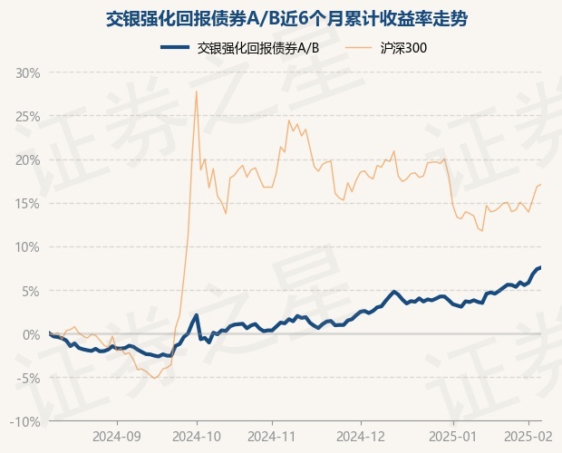 证券之星消息,2月10日,交银强化回报债券A/B最新单位净值为1.1843元,累计净值为1.3923元,较前一交易日上涨0.17%。历史数据显示该基金近1个月上涨3.81%,近3个月上涨6.07%,近6个月上涨7.56%,近1年上涨8.9%。该基金近6个月的累计收益率走势如下图: