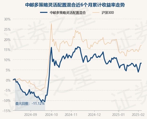 证券之星消息,2月10日,中邮多策略灵活配置混合最新单位净值为1.085元,累计净值为1.506元,较前一交易日上涨0.09%。历史数据显示该基金近1个月上涨3.04%,近3个月下跌5.98%,近6个月上涨8.28%,近1年上涨3.75%。该基金近6个月的累计收益率走势如下图: