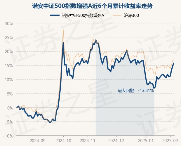 证券之星消息,2月10日,诺安中证500指数增强A最新单位净值为0.8566元,累计净值为0.8566元,较前一交易日上涨0.84%。历史数据显示该基金近1个月上涨8.5%,近3个月下跌5.24%,近6个月上涨15.94%,近1年上涨6.57%。该基金近6个月的累计收益率走势如下图:
