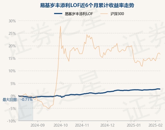 证券之星消息,2月10日,易基岁丰添利LOF最新单位净值为1.6965元,累计净值为2.6075元,较前一交易日下跌0.04%。历史数据显示该基金近1个月上涨0.44%,近3个月上涨1.75%,近6个月上涨2.69%,近1年上涨5.46%。该基金近6个月的累计收益率走势如下图: