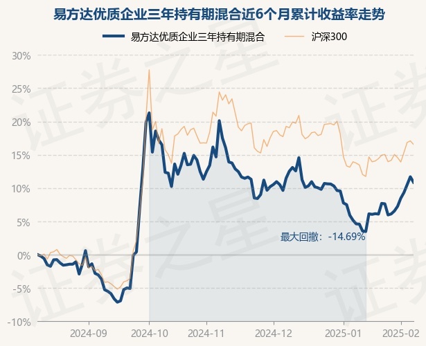 证券之星消息,2月10日,易方达优质企业三年持有期混合最新单位净值为0.8835元,累计净值为0.8835元,较前一交易日上涨1.08%。历史数据显示该基金近1个月上涨7.86%,近3个月下跌4.95%,近6个月上涨11.69%,近1年上涨13.24%。该基金近6个月的累计收益率走势如下图: