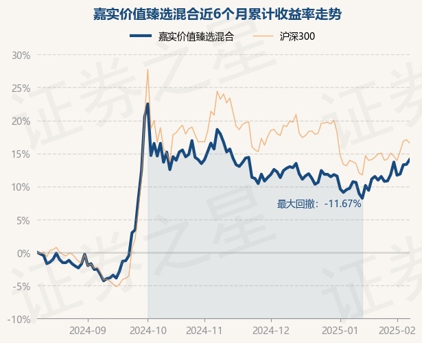 证券之星消息,2月11日,嘉实价值臻选混合最新单位净值为0.8473元,累计净值为0.8473元,较前一交易日上涨0.64%。历史数据显示该基金近1个月上涨4.73%,近3个月下跌2.28%,近6个月上涨14.07%,近1年上涨17.19%。该基金近6个月的累计收益率走势如下图:
