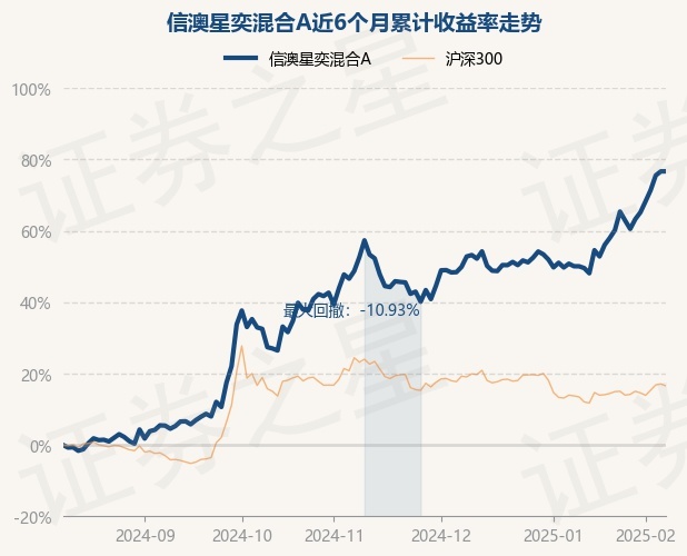 证券之星消息,2月11日,信澳星奕混合A最新单位净值为1.2786元,累计净值为1.2786元,较前一交易日上涨0.0%。历史数据显示该基金近1个月上涨15.62%,近3个月上涨9.9%,近6个月上涨72.92%,近1年上涨72.76%。该基金近6个月的累计收益率走势如下图: