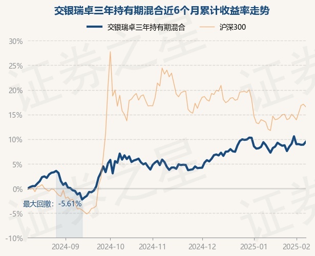证券之星消息,2月11日,交银瑞卓三年持有期混合最新单位净值为0.9384元,累计净值为0.9384元,较前一交易日上涨0.54%。历史数据显示该基金近1个月上涨1.33%,近3个月上涨4.86%,近6个月上涨9.46%,近1年上涨15.01%。该基金近6个月的累计收益率走势如下图: