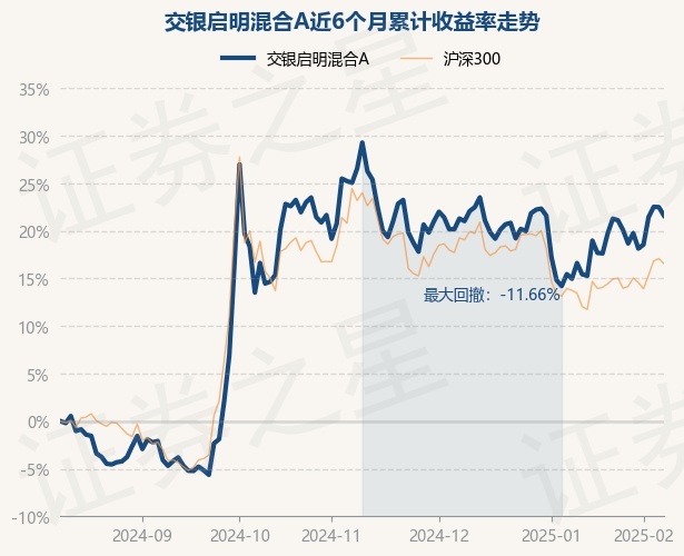证券之星消息,2月11日,交银启明混合A最新单位净值为1.1492元,累计净值为1.3152元,较前一交易日下跌0.73%。历史数据显示该基金近1个月上涨5.34%,近3个月下跌5.93%,近6个月上涨21.61%,近1年上涨17.51%。该基金近6个月的累计收益率走势如下图: