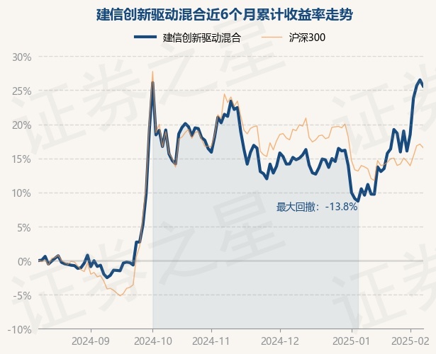 证券之星消息,2月11日,建信创新驱动混合最新单位净值为0.7308元,累计净值为0.7308元,较前一交易日下跌0.72%。历史数据显示该基金近1个月上涨14.46%,近3个月上涨1.78%,近6个月上涨25.61%,近1年上涨13.78%。该基金近6个月的累计收益率走势如下图: