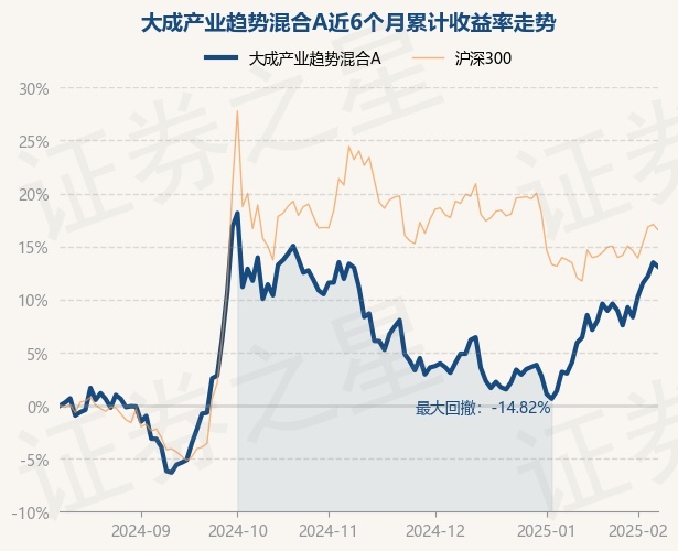 证券之星消息,2月11日,大成产业趋势混合A最新单位净值为1.4781元,累计净值为1.4781元,较前一交易日下跌0.35%。历史数据显示该基金近1个月上涨6.78%,近3个月上涨1.78%,近6个月上涨13.09%,近1年上涨25.37%。该基金近6个月的累计收益率走势如下图: