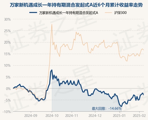 证券之星消息,2月11日,万家新机遇成长一年持有期混合发起式A最新单位净值为0.8389元,累计净值为0.8389元,较前一交易日下跌0.72%。历史数据显示该基金近1个月上涨4.17%,近3个月下跌6.14%,近6个月下跌2.76%,近1年下跌0.02%。该基金近6个月的累计收益率走势如下图: