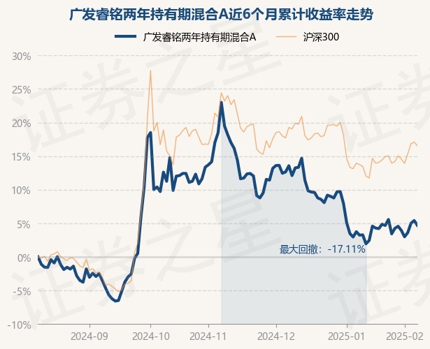 证券之星消息,2月11日,广发睿铭两年持有期混合A最新单位净值为0.9345元,累计净值为0.9345元,较前一交易日下跌0.68%。历史数据显示该基金近1个月上涨2.69%,近3个月下跌11.41%,近6个月上涨4.69%,近1年上涨8.31%。该基金近6个月的累计收益率走势如下图:
