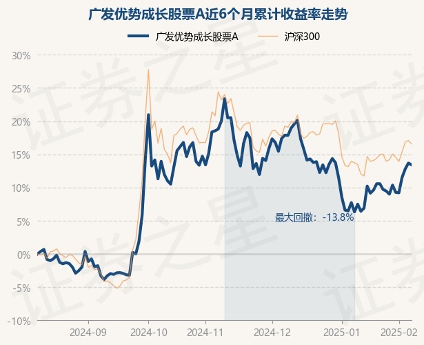 证券之星消息,2月11日,广发优势成长股票A最新单位净值为0.383元,累计净值为0.383元,较前一交易日下跌0.23%。历史数据显示该基金近1个月上涨6.57%,近3个月下跌8.07%,近6个月上涨13.41%,近1年上涨3.37%。该基金近6个月的累计收益率走势如下图: