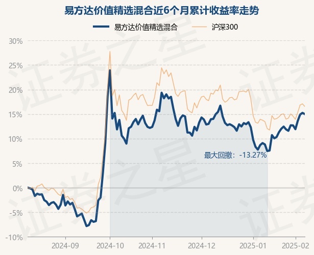 证券之星消息,2月11日,易方达价值精选混合最新单位净值为1.0875元,累计净值为3.8625元,较前一交易日下跌0.22%。历史数据显示该基金近1个月上涨7.03%,近3个月下跌3.35%,近6个月上涨15.03%,近1年上涨8.86%。该基金近6个月的累计收益率走势如下图: