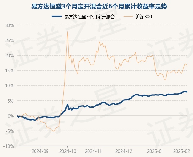 证券之星消息,2月11日,易方达恒盛3个月定开混合最新单位净值为1.1863元,累计净值为1.3743元,较前一交易日下跌0.03%。历史数据显示该基金近1个月上涨1.09%,近3个月上涨3.42%,近6个月上涨7.86%,近1年上涨10.94%。该基金近6个月的累计收益率走势如下图: