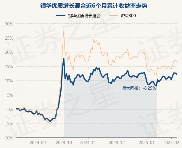证券之星消息,2月11日,银华优质增长混合最新单位净值为1.2762元,累计净值为4.3837元,较前一交易日下跌0.31%。历史数据显示该基金近1个月上涨3.44%,近3个月下跌2.15%,近6个月上涨12.21%,近1年上涨14.12%。该基金近6个月的累计收益率走势如下图: