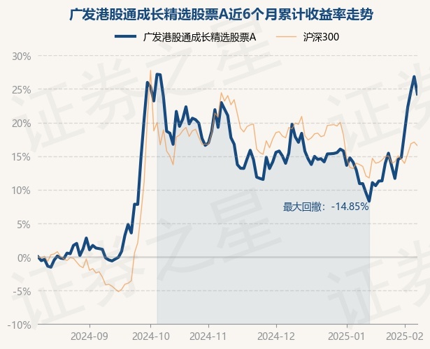 证券之星消息,2月11日,广发港股通成长精选股票A最新单位净值为0.5755元,累计净值为0.5755元,较前一交易日下跌2.04%。历史数据显示该基金近1个月上涨13.42%,近3个月上涨2.64%,近6个月上涨24.24%,近1年上涨25.33%。该基金近6个月的累计收益率走势如下图: