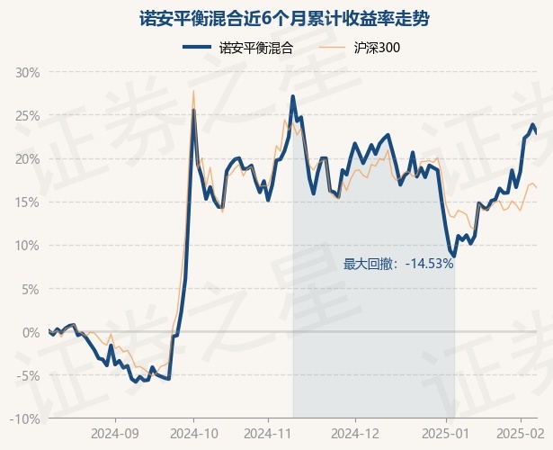 证券之星消息,2月11日,诺安平衡混合最新单位净值为1.2018元,累计净值为3.4618元,较前一交易日下跌0.75%。历史数据显示该基金近1个月上涨11.65%,近3个月下跌3.29%,近6个月上涨22.93%,近1年上涨26.87%。该基金近6个月的累计收益率走势如下图: