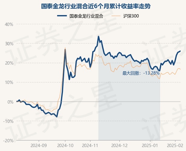 证券之星消息,2月11日,国泰金龙行业混合最新单位净值为0.334元,累计净值为5.702元,较前一交易日上涨0.3%。历史数据显示该基金近1个月上涨8.44%,近3个月下跌5.65%,近6个月上涨26.04%,近1年上涨20.14%。该基金近6个月的累计收益率走势如下图: