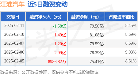 证券之星消息,2月11日,江淮汽车(600418)融资买入4.26亿元,融资偿还5.84亿元,融资净卖出1.58亿元,融资余额79.5亿元,近20个交易日中有13个交易日出现融资净买入。