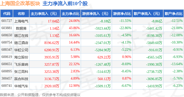 从资金流向上来看,当日上海国企改革板块主力资金净流入15.34亿元,游资资金净流出8.25亿元,散户资金净流出7.09亿元。上海国企改革板块个股资金流向见下表: