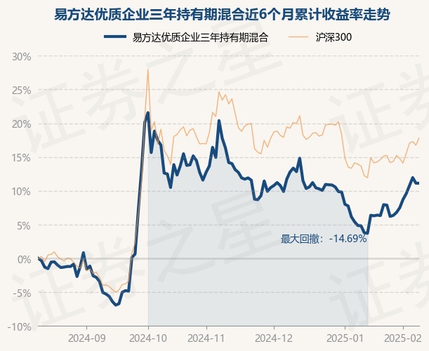 证券之星消息,2月12日,易方达优质企业三年持有期混合最新单位净值为0.895元,累计净值为0.895元,较前一交易日上涨0.0%。历史数据显示该基金近1个月上涨9.27%,近3个月下跌0.68%,近6个月上涨13.41%,近1年上涨14.71%。该基金近6个月的累计收益率走势如下图:
