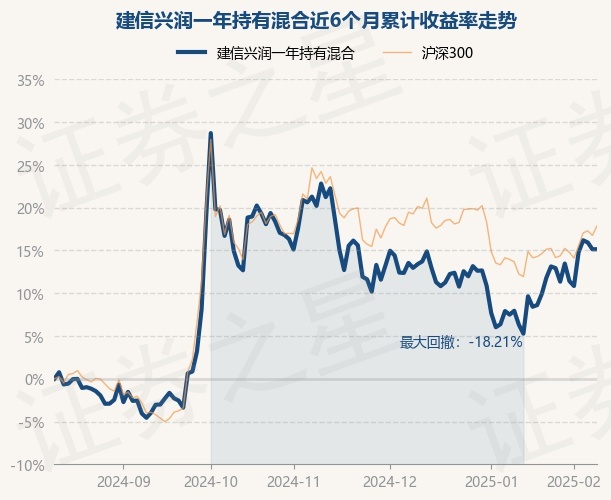 证券之星消息,2月12日,建信兴润一年持有混合最新单位净值为0.6532元,累计净值为0.6532元,较前一交易日上涨0.0%。历史数据显示该基金近1个月上涨10.43%,近3个月下跌3.14%,近6个月上涨17.42%,近1年上涨15.63%。该基金近6个月的累计收益率走势如下图: