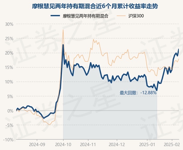 证券之星消息,2月12日,摩根慧见两年持有期混合最新单位净值为0.7884元,累计净值为0.7884元,较前一交易日上涨1.89%。历史数据显示该基金近1个月上涨12.29%,近3个月上涨5.25%,近6个月上涨21.14%,近1年上涨21.84%。该基金近6个月的累计收益率走势如下图: