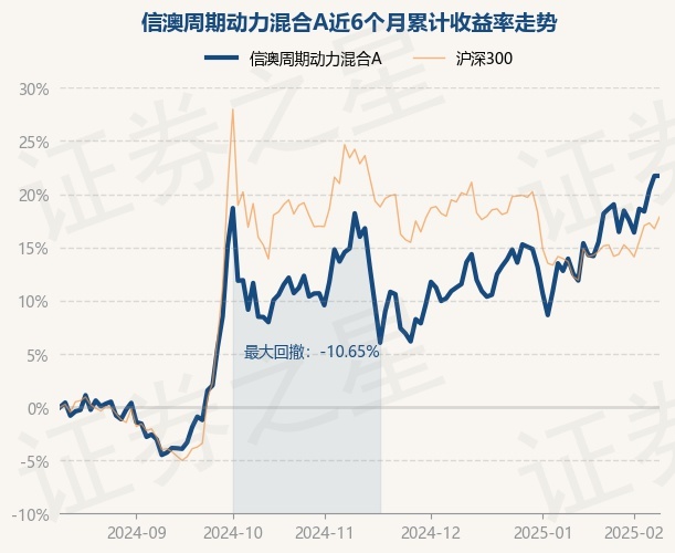 证券之星消息,2月12日,信澳周期动力混合A最新单位净值为1.3223元,累计净值为1.3223元,较前一交易日上涨0.0%。历史数据显示该基金近1个月上涨8.58%,近3个月上涨5.35%,近6个月上涨22.2%,近1年上涨22.16%。该基金近6个月的累计收益率走势如下图: