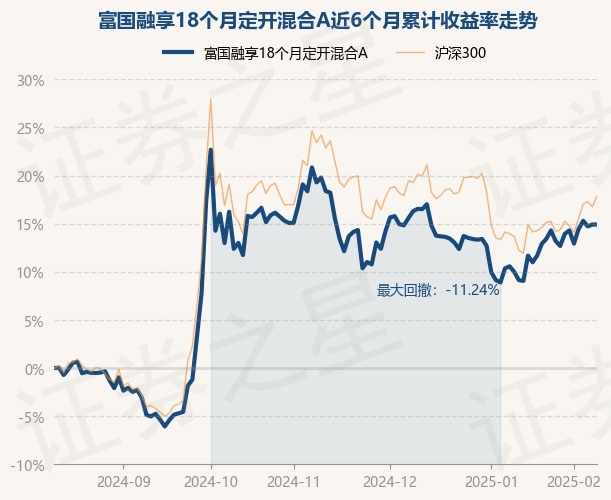 证券之星消息,2月12日,富国融享18个月定开混合A最新单位净值为1.121元,累计净值为1.391元,较前一交易日上涨0.0%。历史数据显示该基金近1个月上涨6.63%,近3个月下跌1.7%,近6个月上涨16.37%,近1年上涨18.85%。该基金近6个月的累计收益率走势如下图: