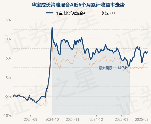 证券之星消息,2月12日,华宝成长策略混合A最新单位净值为1.5001元,累计净值为1.5001元,较前一交易日上涨0.88%。历史数据显示该基金近1个月上涨6.47%,近3个月下跌4.13%,近6个月上涨23.3%,近1年上涨26.1%。该基金近6个月的累计收益率走势如下图: