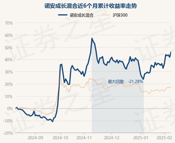 证券之星消息,2月12日,诺安成长混合最新单位净值为1.509元,累计净值为1.954元,较前一交易日上涨2.93%。历史数据显示该基金近1个月上涨13.29%,近3个月下跌5.51%,近6个月上涨45.94%,近1年上涨45.52%。该基金近6个月的累计收益率走势如下图: