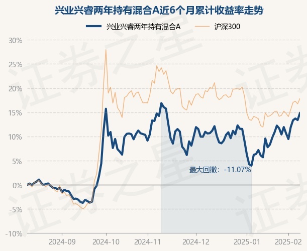 证券之星消息,2月12日,兴业兴睿两年持有混合A最新单位净值为0.831元,累计净值为0.831元,较前一交易日上涨1.28%。历史数据显示该基金近1个月上涨8.27%,近3个月下跌1.07%,近6个月上涨14.84%,近1年上涨13.82%。该基金近6个月的累计收益率走势如下图: