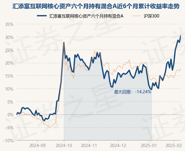 证券之星消息,2月12日,汇添富互联网核心资产六个月持有混合A最新单位净值为0.6917元,累计净值为0.6917元,较前一交易日上涨1.98%。历史数据显示该基金近1个月上涨17.86%,近3个月上涨6.74%,近6个月上涨30.41%,近1年上涨39.2%。该基金近6个月的累计收益率走势如下图: