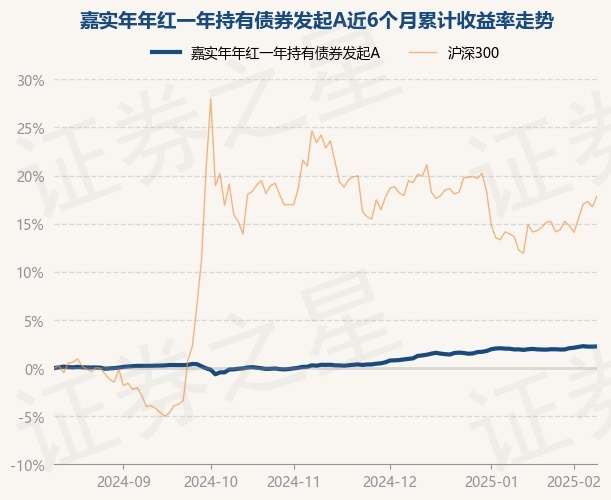 证券之星消息,2月12日,嘉实年年红一年持有债券发起A最新单位净值为1.0773元,累计净值为1.1015元,较前一交易日上涨0.02%。历史数据显示该基金近1个月上涨0.3%,近3个月上涨1.91%,近6个月上涨2.24%,近1年上涨4.17%。该基金近6个月的累计收益率走势如下图: