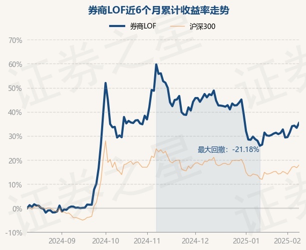 证券之星消息,2月12日,券商LOF最新单位净值为1.1223元,累计净值为0.6511元,较前一交易日上涨1.53%。历史数据显示该基金近1个月上涨7.53%,近3个月下跌11.36%,近6个月上涨35.38%,近1年上涨23.74%。该基金近6个月的累计收益率走势如下图: