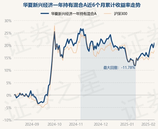 证券之星消息,2月12日,华夏新兴经济一年持有混合A最新单位净值为0.9453元,累计净值为0.9453元,较前一交易日上涨1.53%。历史数据显示该基金近1个月上涨7.9%,近3个月下跌2.41%,近6个月上涨20.87%,近1年上涨31.02%。该基金近6个月的累计收益率走势如下图: