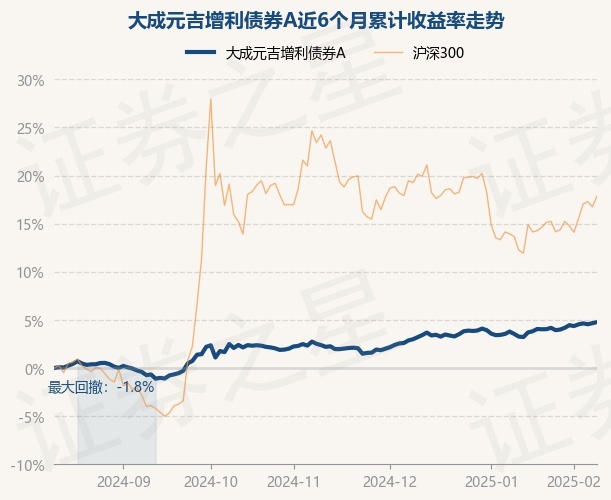 证券之星消息,2月12日,大成元吉增利债券A最新单位净值为1.0619元,累计净值为1.0619元,较前一交易日上涨0.11%。历史数据显示该基金近1个月上涨1.46%,近3个月上涨2.52%,近6个月上涨4.78%,近1年上涨8.71%。该基金近6个月的累计收益率走势如下图: