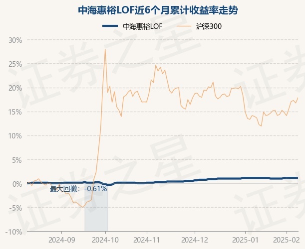 证券之星消息,2月12日,中海惠裕LOF最新单位净值为0.821元,累计净值为1.525元,较前一交易日上涨0.0%。历史数据显示该基金近1个月上涨0.0%,近3个月上涨0.86%,近6个月上涨1.11%,近1年上涨3.01%。该基金近6个月的累计收益率走势如下图: