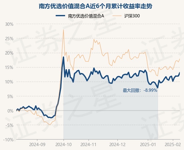 证券之星消息,2月12日,南方优选价值混合A最新单位净值为0.8993元,累计净值为3.4323元,较前一交易日上涨0.98%。历史数据显示该基金近1个月上涨3.88%,近3个月上涨0.28%,近6个月上涨13.03%,近1年上涨14.85%。该基金近6个月的累计收益率走势如下图: