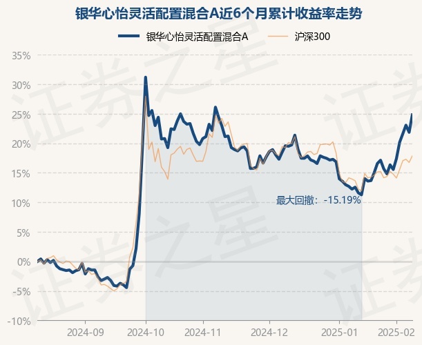 证券之星消息,2月12日,银华心怡灵活配置混合A最新单位净值为2.5325元,累计净值为2.7055元,较前一交易日上涨2.43%。历史数据显示该基金近1个月上涨11.84%,近3个月上涨3.04%,近6个月上涨24.82%,近1年上涨22.46%。该基金近6个月的累计收益率走势如下图: