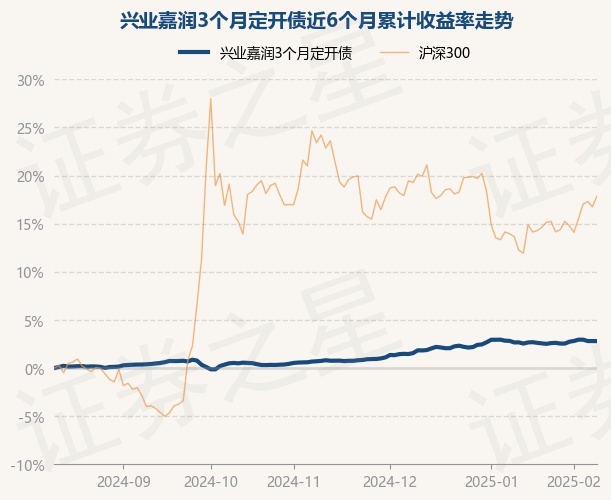 证券之星消息,2月12日,兴业嘉润3个月定开债最新单位净值为1.0673元,累计净值为1.2999元,较前一交易日下跌0.01%。历史数据显示该基金近1个月上涨0.12%,近3个月上涨1.97%,近6个月上涨2.79%,近1年上涨5.65%。该基金近6个月的累计收益率走势如下图: