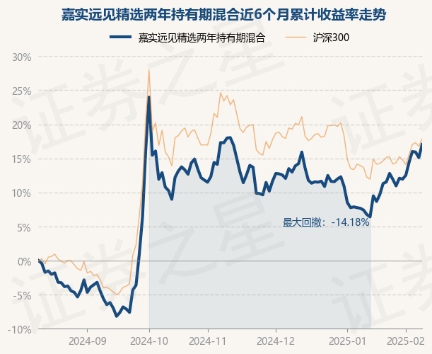 证券之星消息,2月12日,嘉实远见精选两年持有期混合最新单位净值为0.6299元,累计净值为0.6299元,较前一交易日上涨1.68%。历史数据显示该基金近1个月上涨9.62%,近3个月下跌0.85%,近6个月上涨17.04%,近1年上涨9.85%。该基金近6个月的累计收益率走势如下图: