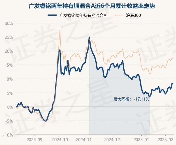 证券之星消息,2月13日,广发睿铭两年持有期混合A最新单位净值为0.9551元,累计净值为0.9551元,较前一交易日上涨0.0%。历史数据显示该基金近1个月上涨4.45%,近3个月下跌7.88%,近6个月上涨8.67%,近1年上涨10.7%。该基金近6个月的累计收益率走势如下图: