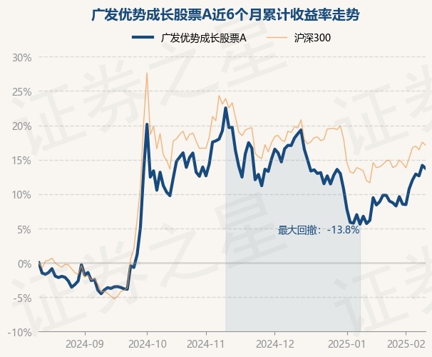 证券之星消息,2月13日,广发优势成长股票A最新单位净值为0.3867元,累计净值为0.3867元,较前一交易日下跌0.39%。历史数据显示该基金近1个月上涨7.12%,近3个月下跌4.99%,近6个月上涨13.74%,近1年上涨4.37%。该基金近6个月的累计收益率走势如下图: