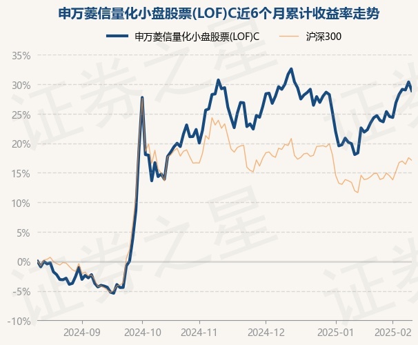 证券之星消息,2月13日,申万菱信量化小盘股票(LOF)C最新单位净值为1.8986元,累计净值为1.8986元,较前一交易日下跌1.14%。历史数据显示该基金近1个月上涨8.9%,近3个月下跌0.4%,近6个月上涨28.9%,近1年上涨30.27%。该基金近6个月的累计收益率走势如下图: