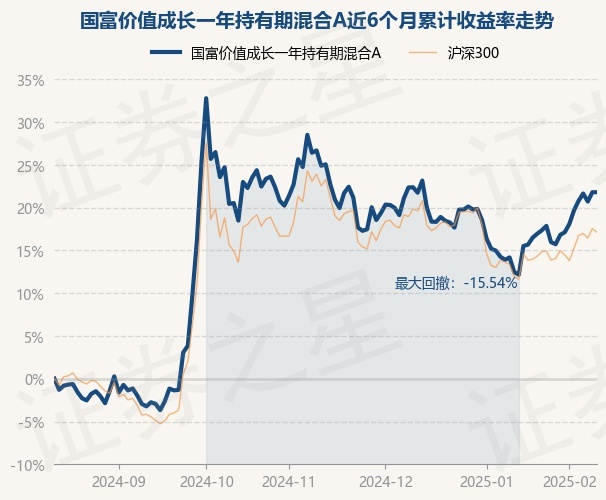 证券之星消息,2月13日,国富价值成长一年持有期混合A最新单位净值为0.8746元,累计净值为1.02元,较前一交易日上涨0.0%。历史数据显示该基金近1个月上涨8.47%,近3个月下跌2.71%,近6个月上涨21.66%,近1年上涨19.68%。该基金近6个月的累计收益率走势如下图: