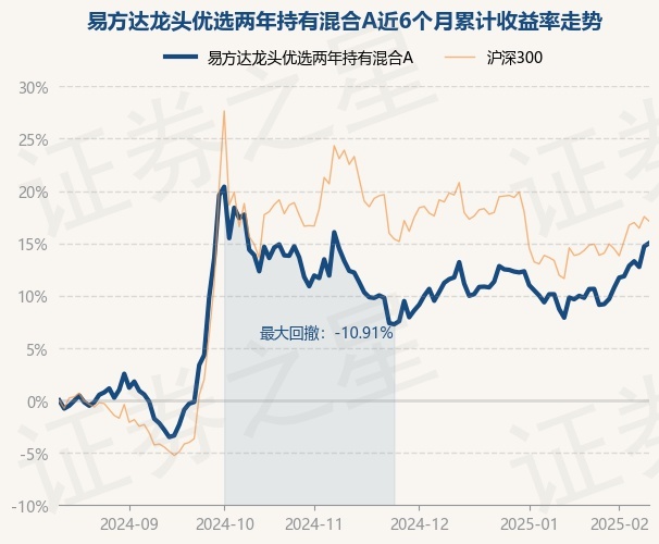 证券之星消息,2月13日,易方达龙头优选两年持有混合A最新单位净值为0.8545元,累计净值为0.8545元,较前一交易日上涨0.27%。历史数据显示该基金近1个月上涨6.6%,近3个月上涨2.51%,近6个月上涨15.02%,近1年上涨12.91%。该基金近6个月的累计收益率走势如下图: