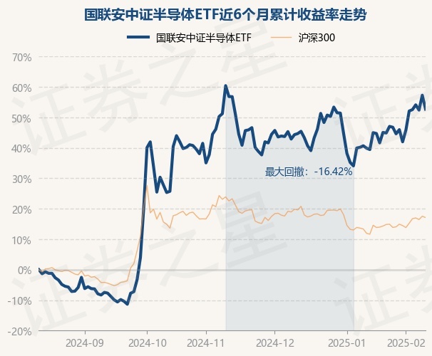 证券之星消息,2月13日,国联安中证半导体ETF最新单位净值为1.0643元,累计净值为2.1286元,较前一交易日下跌2.91%。历史数据显示该基金近1个月上涨9.52%,近3个月下跌2.62%,近6个月上涨52.7%,近1年上涨60.84%。该基金近6个月的累计收益率走势如下图: