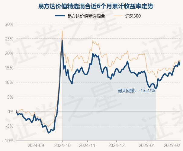 证券之星消息,2月13日,易方达价值精选混合最新单位净值为1.0898元,累计净值为3.8648元,较前一交易日下跌1.14%。历史数据显示该基金近1个月上涨7.17%,近3个月下跌2.74%,近6个月上涨15.71%,近1年上涨9.09%。该基金近6个月的累计收益率走势如下图:
